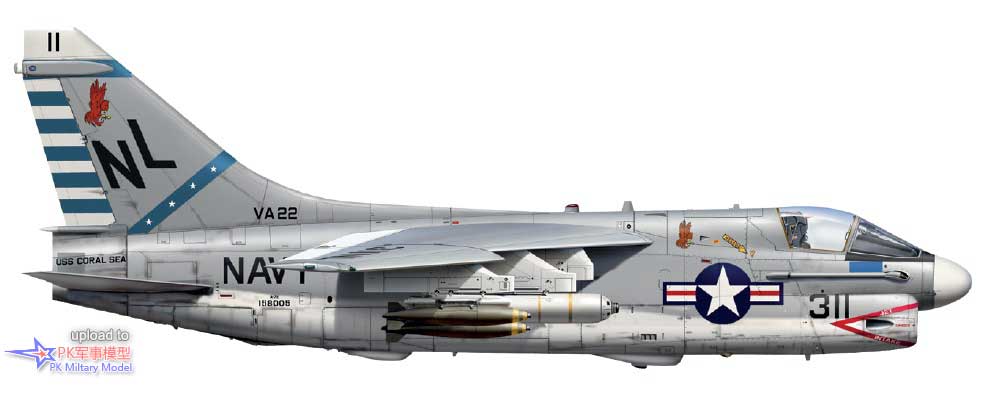 A-7E 158005/NL311,VA-22中队,珊瑚海号,1975年5月。此机于1971年1月25日入役,同年4月交付VA-122中队,5月转交给VA-146中队。1972年6月16日转属VA-22,随后相机服役于VA-25、VA-97、VA-146、VA-304、VA-204和VA-205中队,1988年6月17日退役至亚利桑那州戴维斯.蒙森空军基地的航空航天维护与再生中心(AMARC)。2008年11月报废。这张侧视图再现了1975年5月15日的涂装,当时,马克.斯洛特中尉驾驶此机在玛雅奎兹号事件中参与了对柬埔寨雷姆机场的攻击。这架A-7在两侧的1号和8号挂点总共携带了6枚500磅的Mk82炸弹,在2号和7号挂点各有一枚Mk20石眼集束炸弹。同样还为前机身下方的M61A1火神炮填满了1000发炮弹。