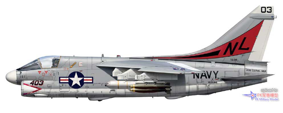 A-7E 157444/NL403,VA-94中队,珊瑚海号,1975年5月。这架A-7E于1970年4月13日交付给美国海军,9天后分配给VA-113中队,不过很快就被转手给了VA-27中队。在VA-94中队服役后,此机于1976年5月从勒莫尔移至塞西尔菲尔德。最初由VA-12中队石眼,后来相继服役于VA-15、VA-174、VA-83和VA-81中队,1986年返回VA-174中队。1987年9月15日,它从这里被送往戴维斯.蒙森基地封存。20年后,于2005年10月拆毁。此机的挂载与上一张侧视图里VA-22中队的A-7E 158005/NL311一样。