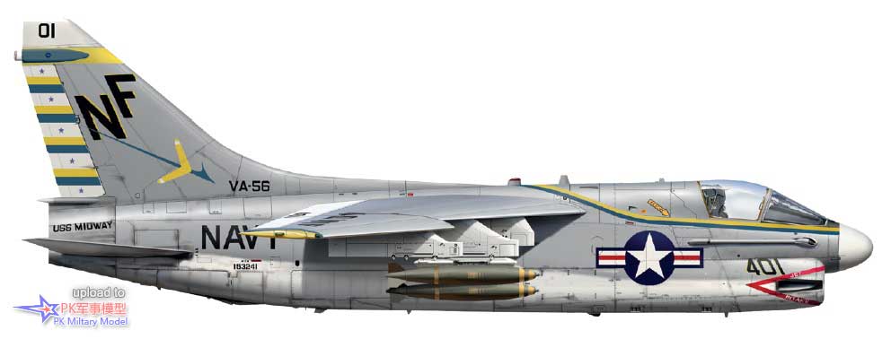 A-7A 153241/NF401,VA-56中队,中途岛号,1976年8月。此机于1967年9月28日服役,不久后被分配给VA-147中队,抵达舰队,并在同年晚些时候,随该中队从游骑兵号上首次执行作战任务。在1973年4月12日转交给VA-56中队之前,它还曾服役于VA-125和VA-153中队。1977年8月8日,这架A-7被送往亚利桑那州戴维斯.蒙森基地封存。六年后,它作为外国军事援助物资被出售给葡萄牙,用于后者A-7的零备件供应,并于1983年10月运往沃特公司位于德克萨斯州达拉斯的工厂。最终,这架飞机被丢弃,目前正等待加州圣罗莎太平洋海岸航空博物馆的修复。这张侧视图里的涂装对应着朝鲜的修剪树木事件,当时,中途岛号和CVW-5联队被匆忙从日本派往朝鲜半岛附近巡逻。它的2号和7号挂点上的每个三联装复合挂架都挂载了3枚1000磅的Mk83炸弹。请注意,航母名称CVA,其中"A"表示"攻击",1975年7月1日后改为CV,结合了空中、地面和反潜任务,具体取决于所涉及的飞机,以表示舰载航空联队的多用途作用。