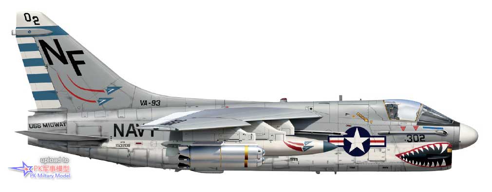 A-7A 153208/NF302,VA-93中队,中途岛号,1976年8月。这架飞机于1967年5月19日交付美国海军,并于当年12月20日进入海军航空试验中心的武器试验舰队服役。随后,它相继服役于VA-122、VA-82、VA-174中队和新墨西哥州基特兰空军基地的海军武器评估设施,然后从1970年12月23日起被存放在戴维斯.蒙森基地。此机于1972年重新投入使用,并最终于1973年4月2日分配给VA-93。1977年5月26日,这架飞机再次退役至航空航天维护与再生中心,并被选为改装成葡萄牙空军的A-7P,且刷上了葡萄牙空军的5536(后来的15536)编号。这架海盗II退役后存放在阿尔韦卡空军基地,然后拆毁。然而,它的驾驶舱部分被保存了下来,并被葡萄牙阿泽特昂的一位私人收藏家收购。这张侧视图里描绘的A-7A在8号挂点(右主翼)和1号挂点(左主翼)的三联装挂架上挂载了三枚Mk20集束炸弹,6号(右主翼)和3号(左主翼)挂载了两个300加仑的副油箱。