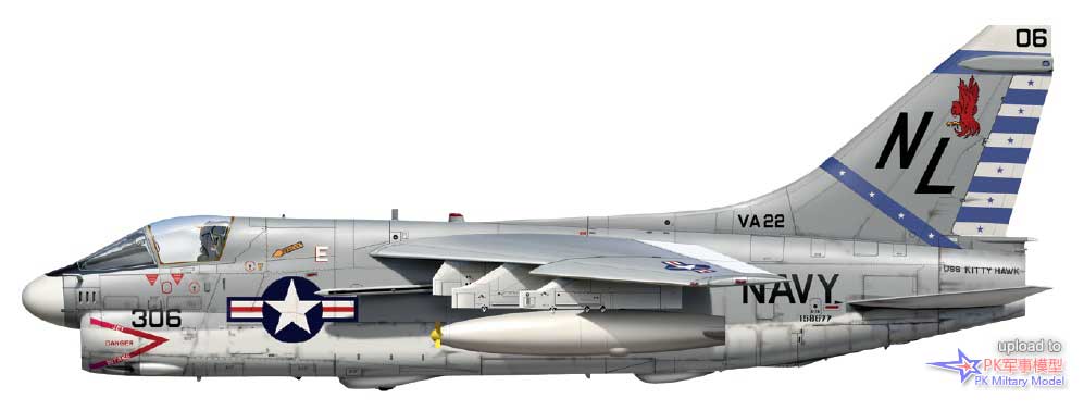 A-7E BuNo158677/NL306,VA-22中队,小鹰号,1979至80年。1972年10月18日,美国海军接收了这架飞机,两天后,这架飞机被交付给VA-22中队。其服役生涯包括在VA-94、VA-195和VA-146中队,1985年1月23日VA-22又一次收到了这架海盗II。随后,它又转辗于VA-94、VA-195、VA-146中队,然后第三次来到VA-22中队。此机于1988年11月退役。在小鹰号1979至80年的西太平洋巡航中,他们参与了伊朗人质危机的早期阶段,并在印度洋度过了短暂的一段时间,这架飞机挂载了一个伙伴加油吊舱,右侧的7号和8号挂点有两个300加仑的油箱,此外没有其它外挂物。
