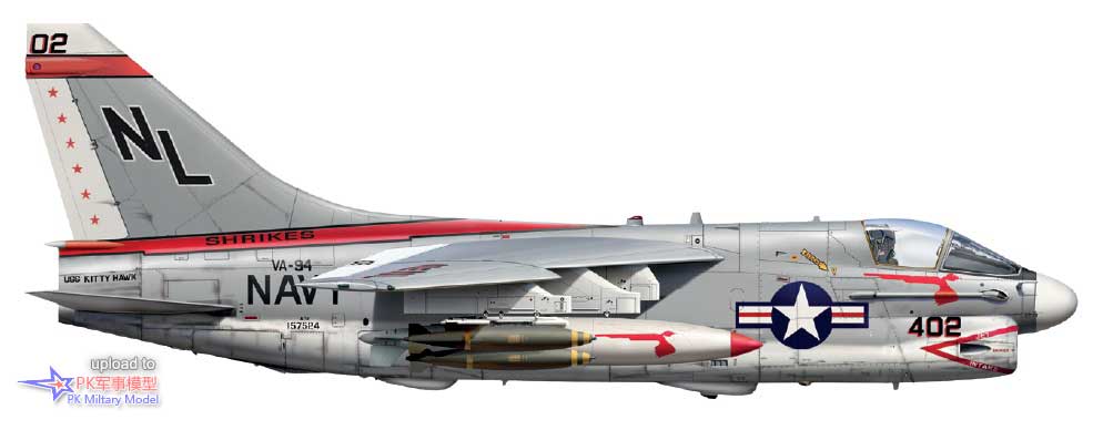 A-7E BuNo157524/NL 402,VA-94中队,小鹰号,1979至80年。沃特公司于1970年8月17日向美国海军交付了这架A-7E,最初服役于VA-192中队,此后相继服役于VA-97、VA-94和VA-146中队,然后在1979年6月6日返回VA-94。1980年底,该飞机再次转给VA-146中队,然后是VA-147和VA-27中队,1983年3月交给VA-122中队。1986年5月6日,它在加利福尼亚海岸附近与VA-122中队的A-7E 160727发生空中相撞后坠毁,两名飞行员均遇难。这架海盗II在1号和8号挂点上均携带了两枚1000磅的Mk83炸弹,并在3号和6号挂点上挂载了两个300加仑的副油箱。
