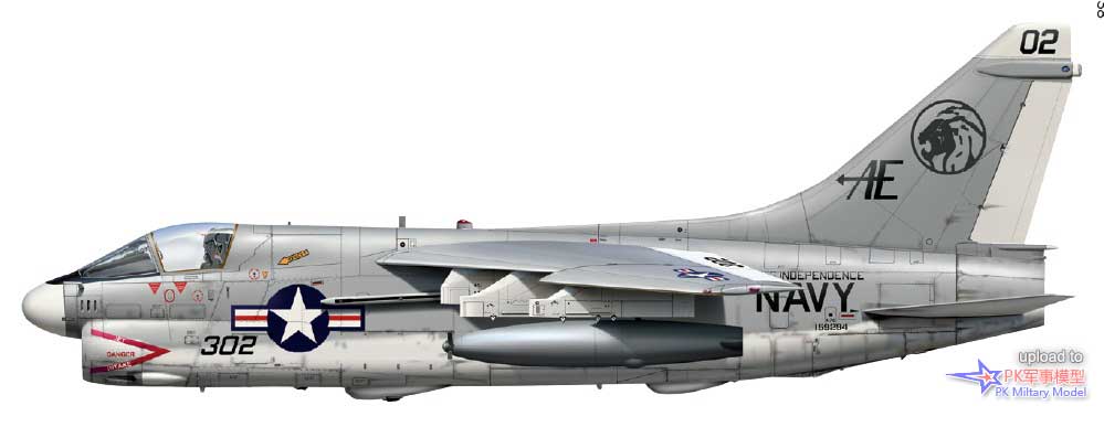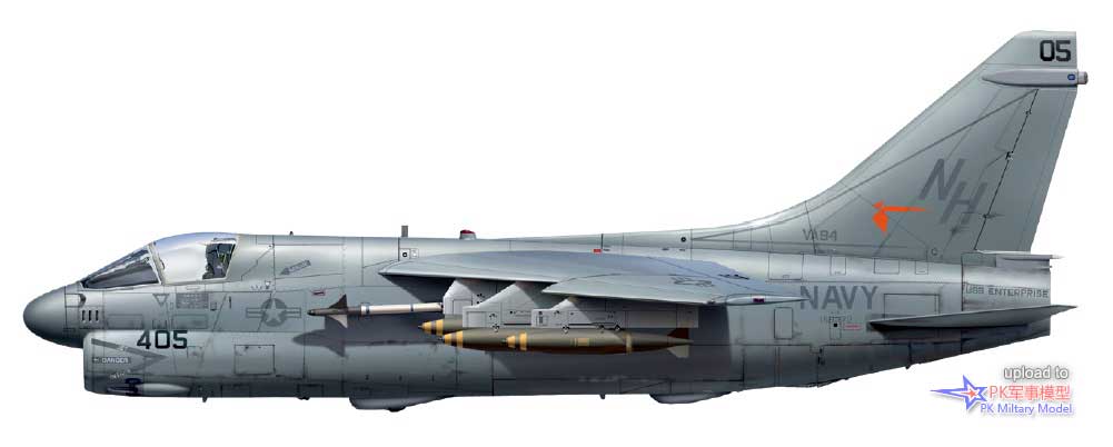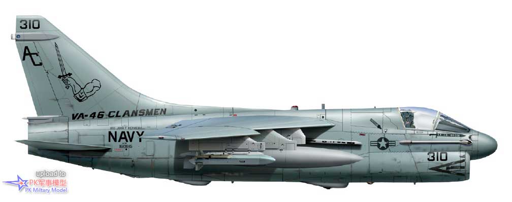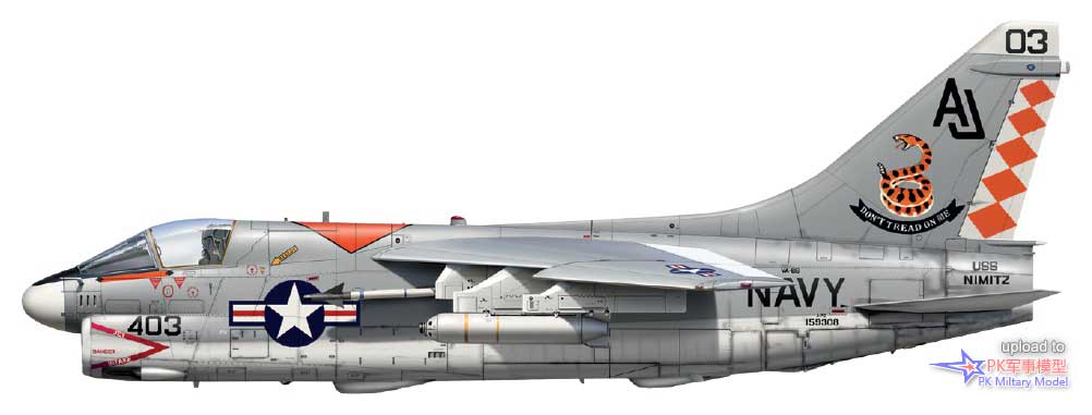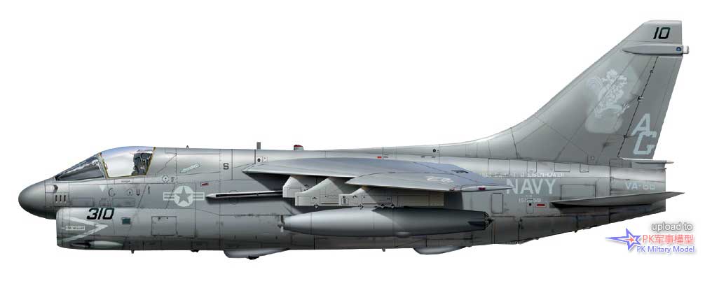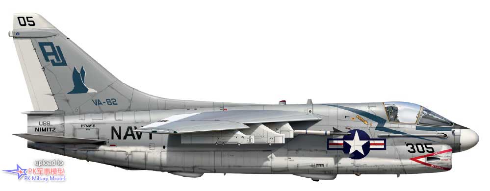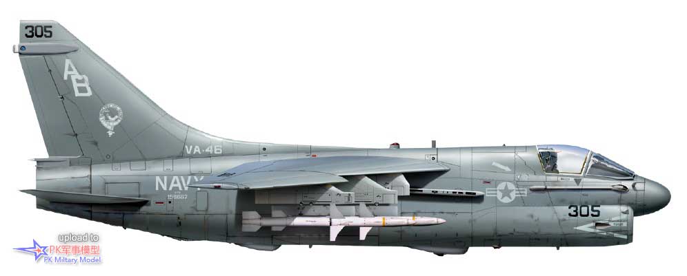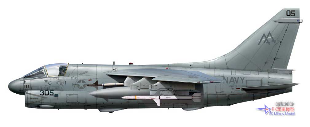 A-7E 160703/AA305,VA-83中队,萨拉托加号,1985至86年。这架飞机于1978年5月5日加入美国海军,第二天被分配给VA-174中队,两年后转属VA-81中队。1980年9月24日加入VA-83中队,1987年6月转手给VA-46中队,并一直使用至退役,且参与了1991年沙漠风暴行动的战斗。同年6月10日,BuNo 160703号机进入戴维斯.蒙森基地封存,仍然保留着任务出击标记。它于1994年被借给亚利桑那州的皮马航空航天博物馆保存,四年后被该组织正式购买,本文撰写时仍保存在那里。本图中的1号挂点挂载了一枚哈姆导弹、3号挂点有一台300加仑副油箱、4号和5号挂点各一枚AIM-9L响尾蛇,此外在6号和7号挂点的挂架上还各有一枚Mk20集束炸弹。