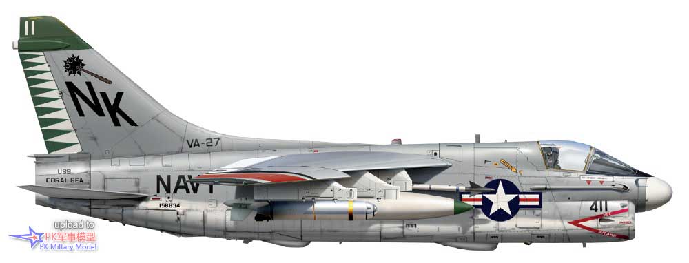 A-7E 158834/NK411,VA-27中队,珊瑚海号,1980年。这架飞机于1973年8月21日交付美国海军,第二天加入VA-25中队,直到1979年2月12日转交给VA-27中队。正如右翼看到的红黑识别带所示,此机参加了CVW-14联队1979至80年的西太平洋巡航,在伊朗人质危机期间,珊瑚海号于印度洋停留了数周。1980年5月,CVW-14和CVW-5联队在菲律宾的古比点交换了一些A-7E,这是一种常见的做法,把高时数的飞机送回美国本土进行基地级维修。然而,这架海盗II与VA-56中队的相处将是短暂的,因为同年11月14日,它在中途岛号的一次轰炸训练任务中因一次致命的事故而坠毁。