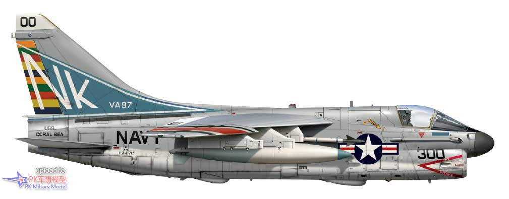 A-7E 156872/NK300,VA-97中队,珊瑚海号,1980年。此机于1970年2月28日交付给VA-25中队,随后由VA-97中队使用,直到1981年9月转手给加利福尼亚州中国湖海军武器中心(NWC)的VX-5中队。之后回到美国海军预备役,1983年8月先是交给VA-203中队,1984年7月又转给VA-205中队,1988年6月24日退役,2005年拆毁。除了伊朗人质营救行动识别带外,这架A-7还拥有一个彩色的方向舵,因为它是VA-97中队的联队长机。这意味着飞机在垂尾上,通常在尾舵上(如图所示)或整个尾翼表面上显示了所有中队的颜色,并在座舱下方和垂尾顶部涂有"00"的战术编号。这架飞机仅在4号和5号挂点挂载AIM-9L响尾蛇,并在2号和7号挂点挂载了两个300加仑副油箱。