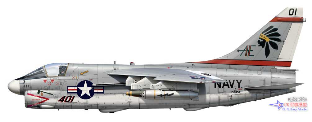 A-7E 156807/AE401,VA-87中队,独立号,1983至84年。沃特公司于1969年11月6日交付了这架A-7E,第二天就被分配给VA-147中队。在1981年2月25日转交给VA-87中队之前,它一直隶属于VA-25中队。1984年8月,此机转手给VA-174中队,随后长时间服役于VA-87中队,接着是VA-86和VA-83中队,然后于1987年2月19日被送进戴维斯.蒙森基地封存。它于2005年3月被拖出仓库,成为内华达州法龙航空站靶场的目标。这架飞机被描绘成格林纳达上空紧急狂怒行动的典型武器配置----1号和8号挂点的一枚CBU-59集束炸弹(注意弹体上的黑色闪电标记,以区别于早期的Mk20石眼),以及2号和7号挂点上的1000磅Mk83炸弹。