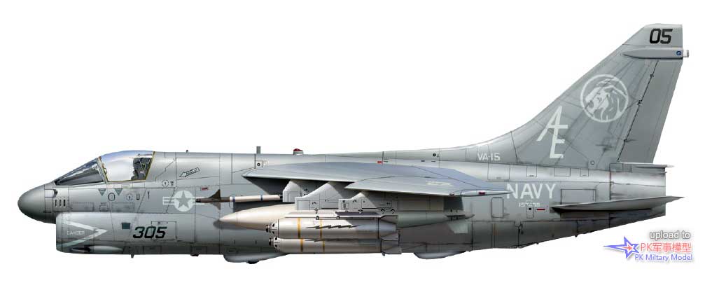 A-7E 157468/AE305,VA-15,独立号,1983年。这架A-7于1970年5月28日交付美国海军,第二天就分配给塞西尔菲尔德机场的VA-81中队。在1981年10月28日转交给VA-15中队之前,它相继服役于VA-174、VA-12和VA-174中队。1983年12月4日,CVW-6联队长爱德华.安德鲁斯驾驶此机在突袭叙利亚阵地时被击落。它在黎巴嫩突袭行动中携带的武器包括1号挂点三联装复合挂架上的三枚CBU-59集束炸弹、3号挂点的一个300加仑副油箱、4号挂点的一枚AIM-9L响尾蛇、6号挂点的一台前视红外吊舱(5号挂点没有响尾蛇)和8号挂点三联装复合挂架上的三枚CBU-59。