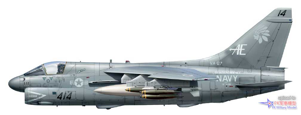 A-7E 157566/AE414,VA-87中队,独立号,1983至84年。此机于1970年11月11日交付美国海军,曾与VA-66和VA-174中队一起飞行,1983年4月15日加入VA-87中队。在1987年8月26日进入戴维斯.蒙森基地封存之前,它再度服役于VA-37、VA-81和VA-174中队。这架海盗II于2008年11月被拆毁,照片中,主翼1号挂点的一个三联装挂架上挂载了3枚500磅的Mk82炸弹,另一枚Mk82直接安装在2挂点的挂架上,3号挂点有一个300加仑的副油箱,右侧的挂载和左侧一样。