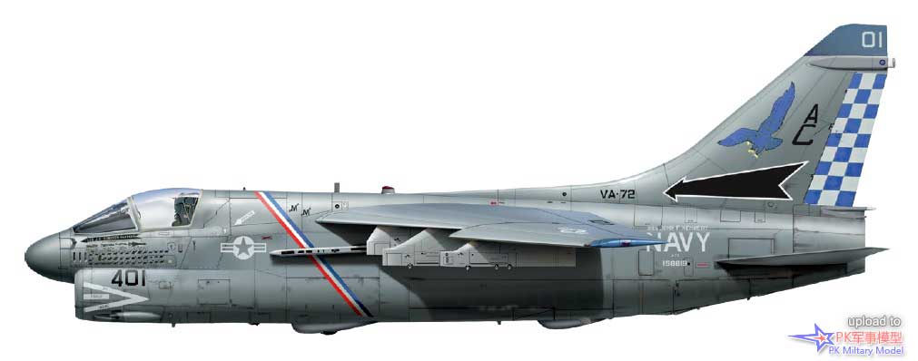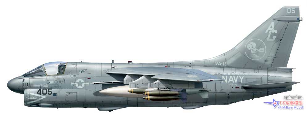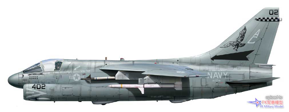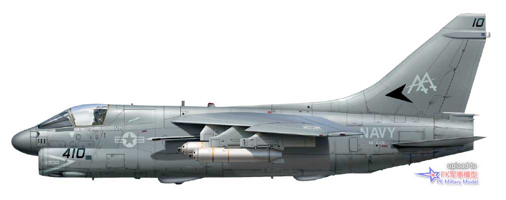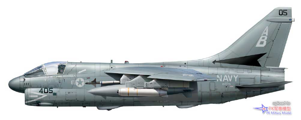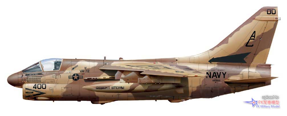 A-7E 159971/AB405,VA-72中队,美国号,1986年。这架A-7于1976年3月9日由美国海军接收,并直接交付给位于帕塔克森特河基地的海军试飞中心机队。它于当年8月加入VA-72中队,后来相继服役于VA-174、VA-37、VA-105、VA-15和VA-66中队,之后在1986年1月17日加入VA-72中队,并一直使用至退役。1986年10月1日,VA-72中队从CVW-1联队转入CVW-7联队旗下,1989年3月1日又转属CVW-3联队。作为"Decoy 404",它在沙漠风暴行动中完成了24次任务。当年夏天退役后,此机在田纳西州的孟菲斯的海军高级技术训练司令部(NATTC)当作教具,之后被北卡罗来纳州夏洛特市的卡罗莱纳航空博物馆收购保存,其方案和涂装代表了它最后几个月的服役历程。1986年初春,在利比亚附近的行动中,这架海盗II在两个挂点(4号和5号)上都挂载了AIM-9L响尾蛇,并在2号、7号和8号的挂点上挂载了Mk20集束炸弹。此外它的3号和6号挂点分别挂载了一个300加仑副油箱和一个前视红外吊舱。
