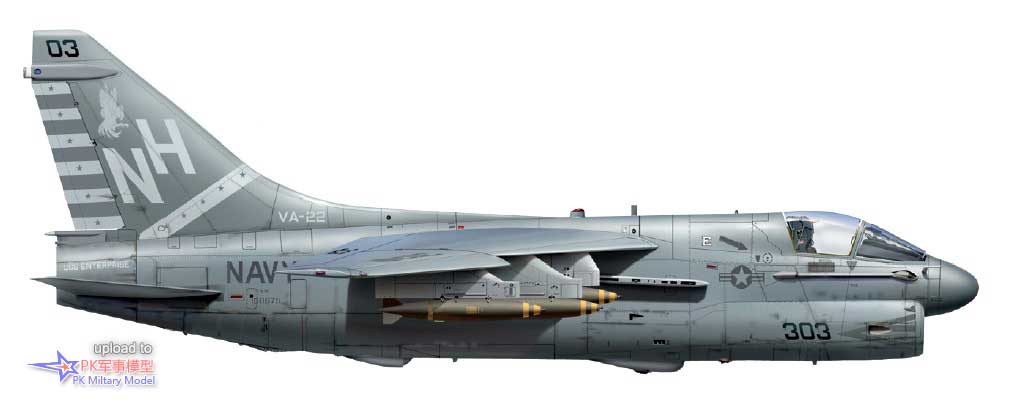 A-7E 158675/NH303,VA-22中队,企业号,1988年。美国海军于1972年10月26日接收了这架A-7,6天后被移交给VA-94中队。在1984年1月6日加入VA-22中队之前,它一直服役于VA-146中队。然而,1984年5月至1985年2月,当VA-22中队随CVW-11联队登上企业号巡航时,它被借给了VA-122中队。1988年4月18日,在CVW-11联队与伊朗伊斯兰共和国海军进行为期一天的海上战争(代号为螳螂行动)期间,此机从企业号上起飞。1989年4月27日退役后封存于戴维斯.蒙森基地,2005年5月从拖往法龙海军航空站的靶场。
