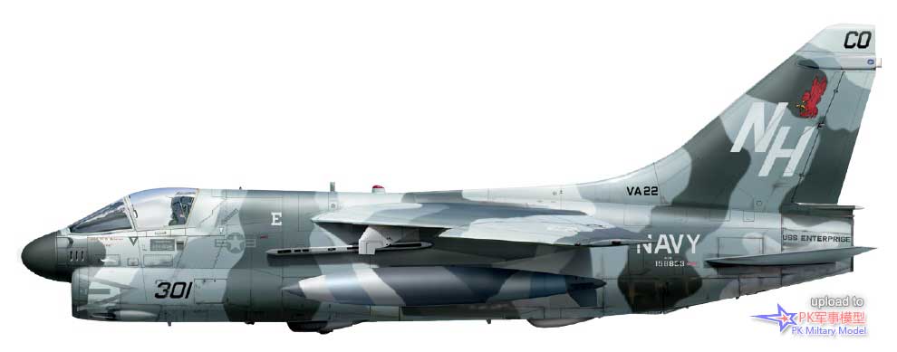 A-7E 158833/NH301,VA-22中队,企业号,1988年。1973年8月22日,美国海军在沃特的达拉斯工厂验收了这架飞机,并于两天后转交给VA-113中队。它在三个不同的场合和两个时期分别由VA-97和VA-195中队使用,此后是VA-56和VA-25中队,接着于1985年6月13日转交给VA-22中队。BuNo158833号机是第二架收到这一实验性涂装方案的"Beefsteak 301",BuNo 160537号机已在1987年初采用了类似的涂装,但于同年7月调出该单位。1988年,当CVW-11联队在企业号上的部署接近尾声时,BuNo 158833号机收到了这种独特的伪装。此机在螳螂行动中参与了击沉伊朗萨罕德号护卫舰的行动,且在座舱下方用白色描绘了这艘护卫舰的轮廓,以示战绩。它于1990年4月16日退役,累积飞行时间7012小时,此后被选入泰国皇家海军的外国军售项目,并通过公路送往杰克逊维尔,最终于1995年10月移交泰国,接着服役于乌塔堡基地(序列号1414),经过退役和一段时期的封存,此机于2015年在泰国克拉比的空军博物馆展出。