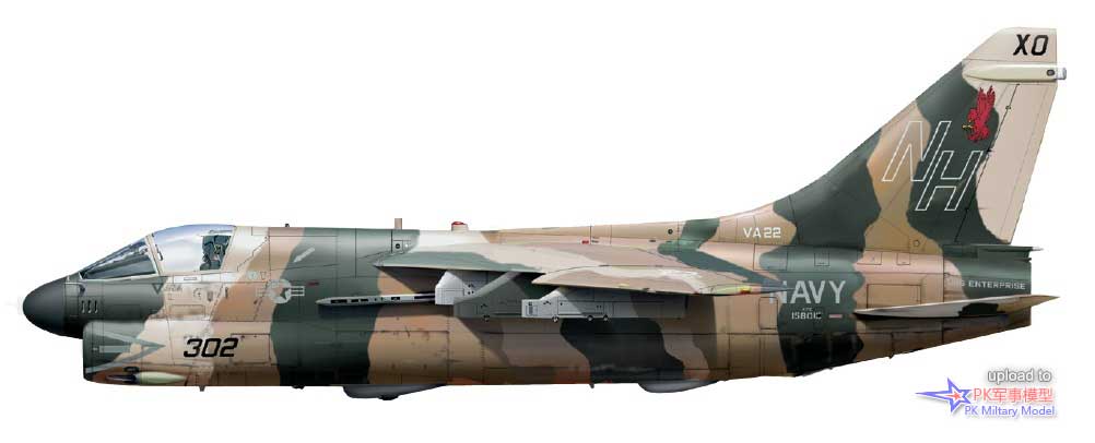 A-7E 158013/NH302,VA-22中队,企业号,1987年。这架A-7E于1971年4月20日被美国海军接收,并很快被分配给VA-147中队,随后相继服役于VA-94、VA-122、VA-195和VA-146中队,1985年3月14日加入VA-22。此机也还获得了一次性伪装方案,比"Beefsteak 301"的蓝/灰三色迷彩更适合在中东的陆地上空的行动。这架飞机从未随VA-22中队参与真正的作战部署,因此把"沙漠伪装"计划的最终考验,并于1987年5月20日转手给VA-97中队。它的替代品将保留标准的战术涂装方案中。BuNo 158013号机随VA-97中队一直呆到1989年11月28日退役,并进入戴维斯.蒙森基地封存。它于2008年4月离开这里,前往北卡罗来纳州的切里点陆战队航空站,最终用作靶场目标。