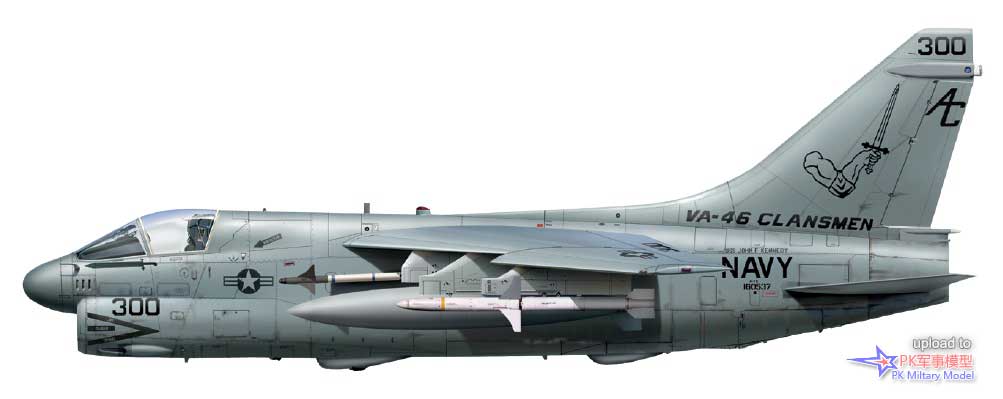 A-7E 160537/AC300,VA-46中队,肯尼迪号,1990至91年。此机于1977年1月31日交付美国海军,次日在勒莫尔分配给VA-113中队。同年5月,飞往日本,由VA-93中队使用,并于1980年9月与VA-146进行了交流。这架飞机于1981年5月再次返回日本,服役于VA-93中队。VA-113中队第二次接收BuNo 160537号机,并于1982年9月将其送回勒莫尔,次年加入VA-122中队,1985年1月31日转属VA-22中队。从1990年3月起,这架A-7继续在VA-46中队里服役,并参与了沙漠风暴行动----这架海盗II是1991年1月17日凌晨参与夜间袭击巴格达地区的8名哈姆"射手"之一,由约翰.克拉斯上尉尉驾驶。1991年夏退役后,作为1992年协议的一部分,此机作为50架A-7E和18架TA-7C军援项目的一部分被出售给希腊空军。此机的最后一次被记录是2014年储存在希腊阿拉克索斯空军基地。图中描绘的是沙漠风暴行动第一晚的挂载方案,在1号、7号和8号挂点上挂载了3枚哈姆导弹,并在4号和5号挂点上挂载了AIM-9L响尾蛇,此外还在3号和6号挂点上各挂载一个300加仑的副箱。