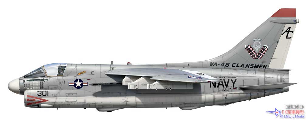 A-7E 160714/AC301,VA-46中队,肯尼迪号,1991年。这架飞机于1978年5月24日交付美国海军,六天后分配给VA-174中队。随后相继服役于VA-81、VA-83、VA-66、VA-72、VA-203、VA-46和VA-105中队,然后于1990年4月20日返回VA-46中队。沙漠风暴行动结束后,此机采用了这一复古方案,"Tartan 301"不仅刷上了VA-46中队令人印象深刻的任务记录,而且还在垂尾上涂有"1955-1991"字样和发动机排气管罩上精选的维护人员的姓名条。BuNo 160714号机于1991年6月11日退役,目前,它仍然保存在佛罗里达州彭萨科拉的美国海军航空博物馆内。