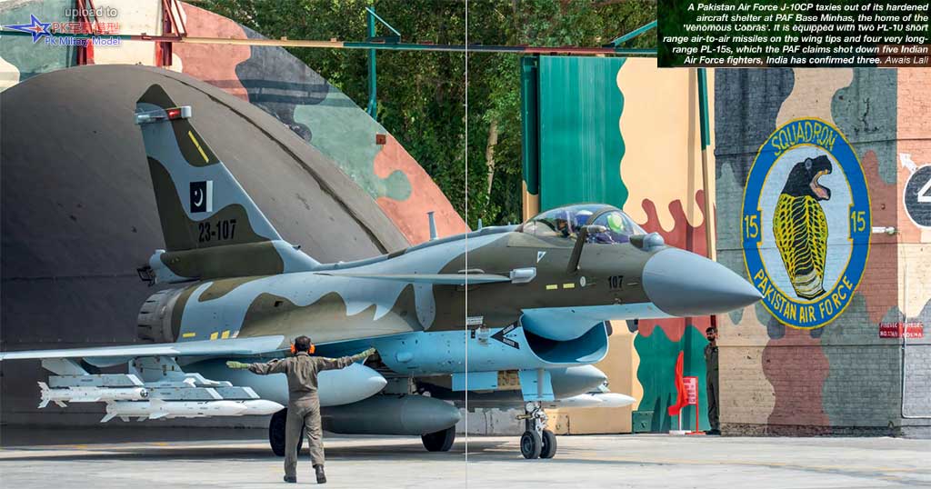 一架巴基斯坦空军歼-10C战机滑出位于米纳斯空军基地的坚固机库,这里是"眼镜蛇"中队的基地。此机翼尖挂载了两枚霹雳-10短程空对空导弹,此外还有四枚霹雳-15超远程空对空导弹。巴基斯坦空军声称,他们击落了五架印度空军的战机,而印度方面已确认其中的三架。
