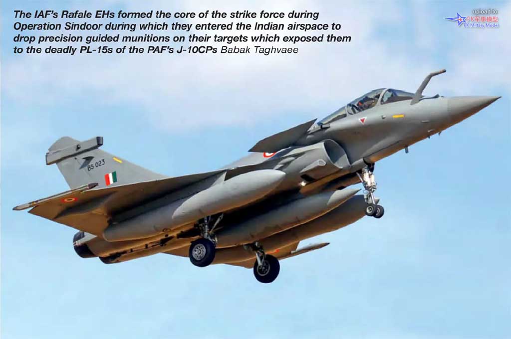 印度空军的阵风EH战斗机是辛杜尔行动中打击力量的核心,他们从印度领空,向目标投放精确制导弹药,使目标暴露在巴基斯坦空军歼-10C战斗机的致命霹雳-15导弹之下(此战中印度空军总共了损失的4架阵风EH,编号分别是BS001、BS021、BS022和BS027)。