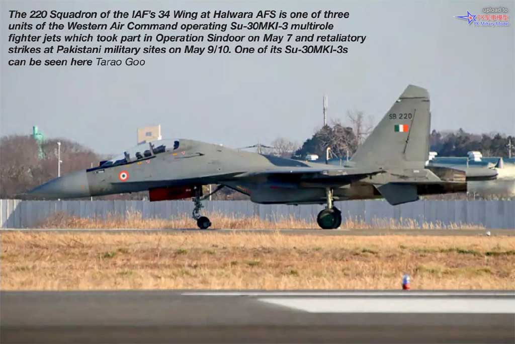 位于哈尔瓦拉空军基地的印度空军第34联队第220中队是西方空军司令部下属的三支装备 苏-30MKI-3多用途战斗机的部队之一,该中队参加了5月7日的辛杜尔行动以及5月9/10日对巴基斯坦军事基地的报复性打击。图中是该中队的一架苏-30MKI-3。