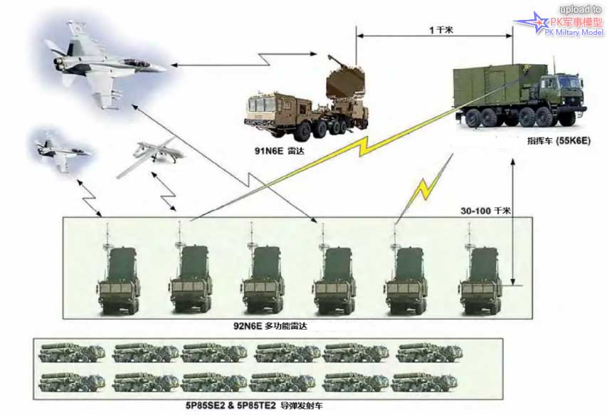 组成完整S-400系统的四套移动系统。从左到右依次为55K6E指挥车、92N6E目标搜索雷达、91N6E监视雷达和5P85SE2/SP85TE2导弹发射车。91N6E“大爆炸”雷达通常停放在距离指挥管制车约1千米的地方,而92N6E目标搜索雷达则可在30至100千米外找到。