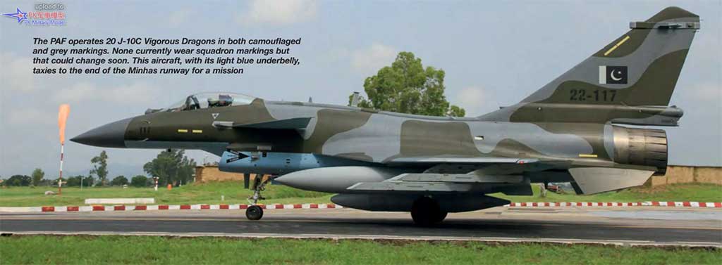 巴基斯坦空军现役20架歼-10C猛龙战斗机,涂装为迷彩和灰色两种式样。目前这些战机均未涂刷中队标识,但这种情况可能很快就会改变。这架机身呈浅蓝色的飞机正滑行至米纳斯基地跑道的尽头,准备执行任务。