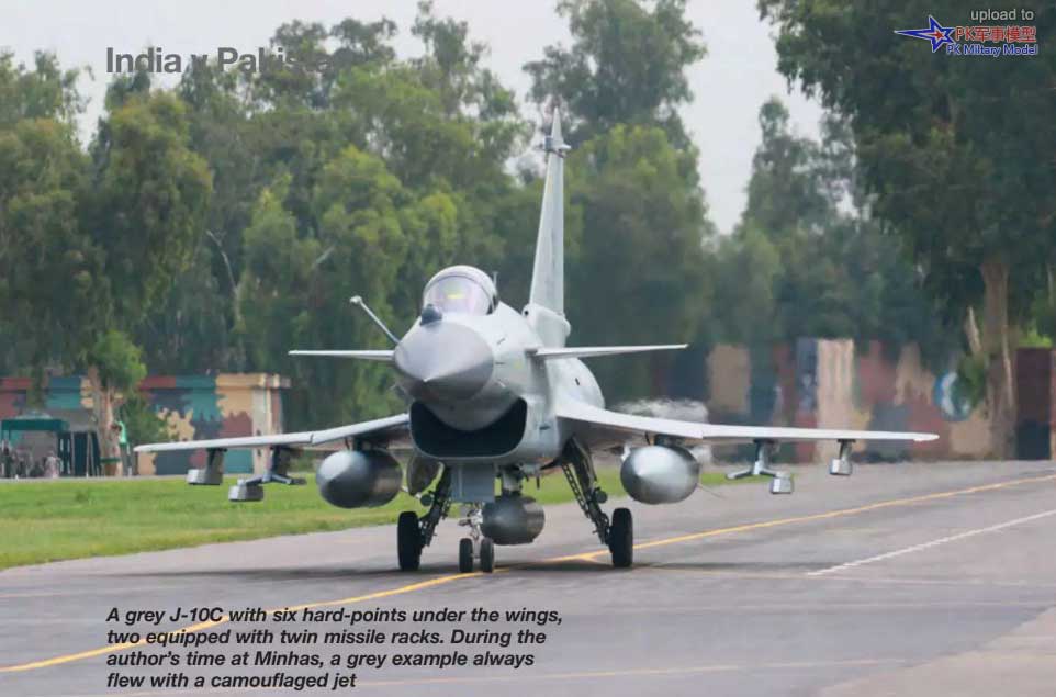 一架灰色的歼-10C,机翼下有六个挂架,其中两个配备双联导弹挂架。作者在米纳斯空军基地访问期间,一架灰色的歼-10C总是与一架迷彩涂装的歼-10C一起飞行。